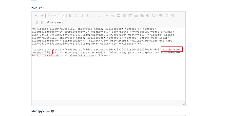 Если видео растянулось по высоте, то можно скорректировать размер. Откройте снова код и укажите