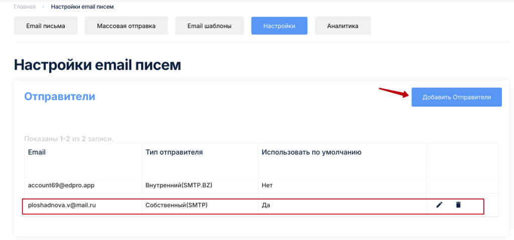 Настройки email писем — это настройки для отправки исходящих электронных писем клиентам. В этом разделе вы можете настроить почтовый сервер, с помощью которого доставляются письма. На платформе EdproBiz имеется встроенный почтовый сервер, который используется по умолчанию для отправки исходящих сообщений. Но вы можете подключить собственный почтовый сервер.