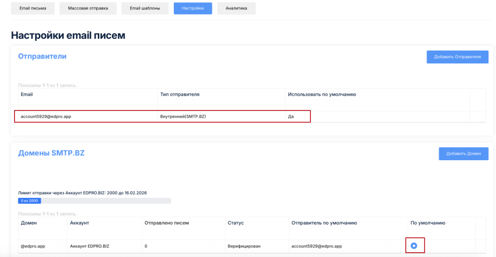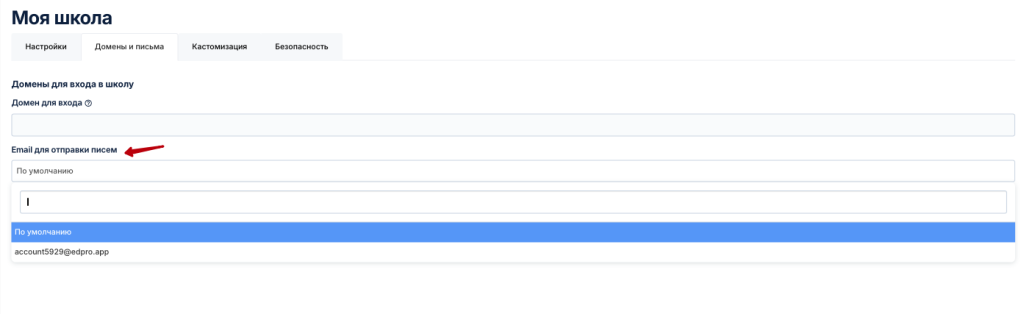 После изменения почтового домена вы можете указать его по умолчанию. Также для разных школ (в настройках школы) и разных писем (в настройках конкретного письма) вы можете настраивать разных почтовых отправителей.