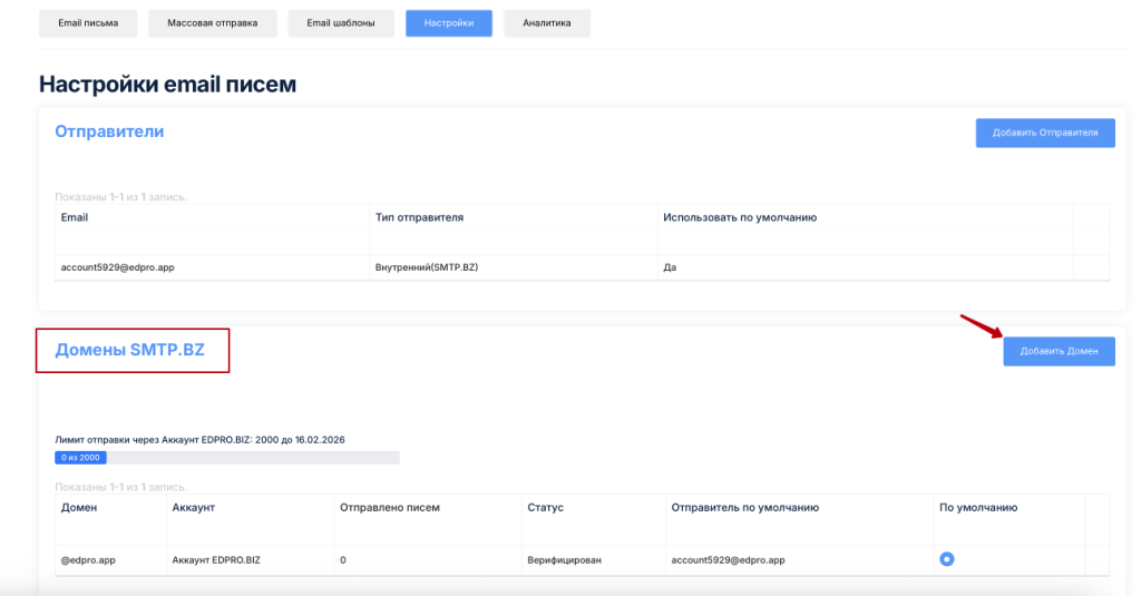 1. Как отправлять письма с встроенного почтового сервера платформы (домен @edpro.app)?