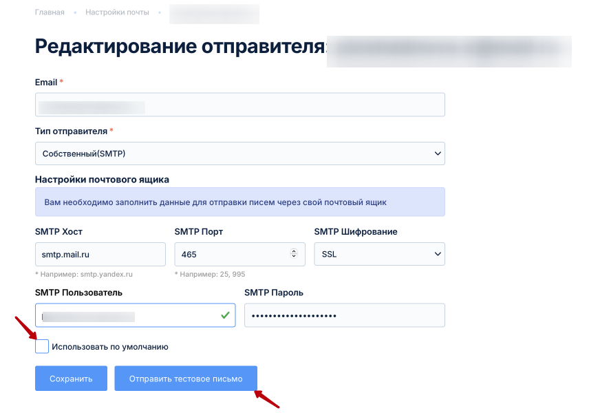 Перед сохранением отправьте тестовое письмо, чтобы проверить настройки.